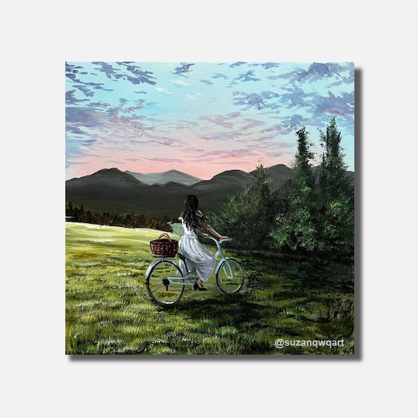 I paint landscapes and add elements of life for romantic vibes. I like to use soft colors to create calm and inviting atmospheres.
