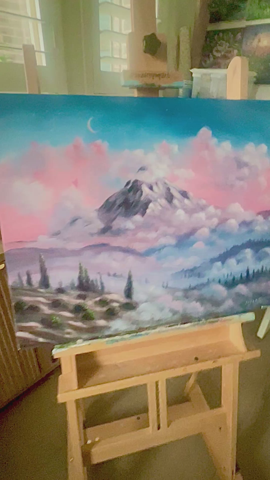 This painting is an original masterpiece that captures the breathtaking beauty of a purple mountain surrounded with cotton candy clouds. The attention to detail is exceptional, with every brushstroke adding depth and dimension to the painting. This stunning work of art is the perfect addition to any home, office or art collection, and is sure to inspire a sense of awe and wonder in all who view it.